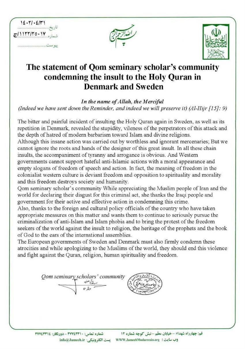 The Statement of Qom Seminary Scholar's Community Condemning the insult to the Holy Quran in Denmark and Sweden