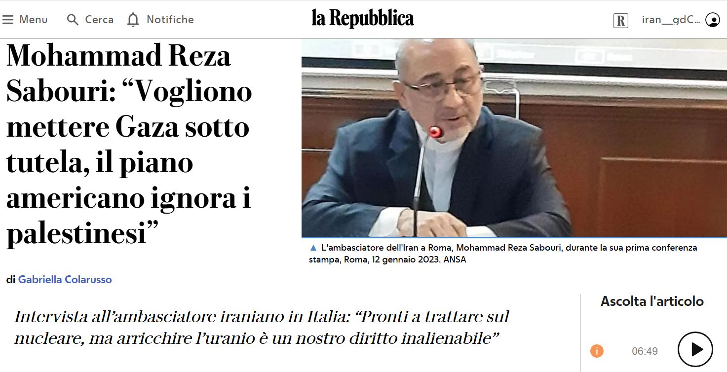 Il testo completo dell'intervista del quotidiano La Repubblica all'Ambasciatore della Repubblica Islamica dell'Iran a Roma