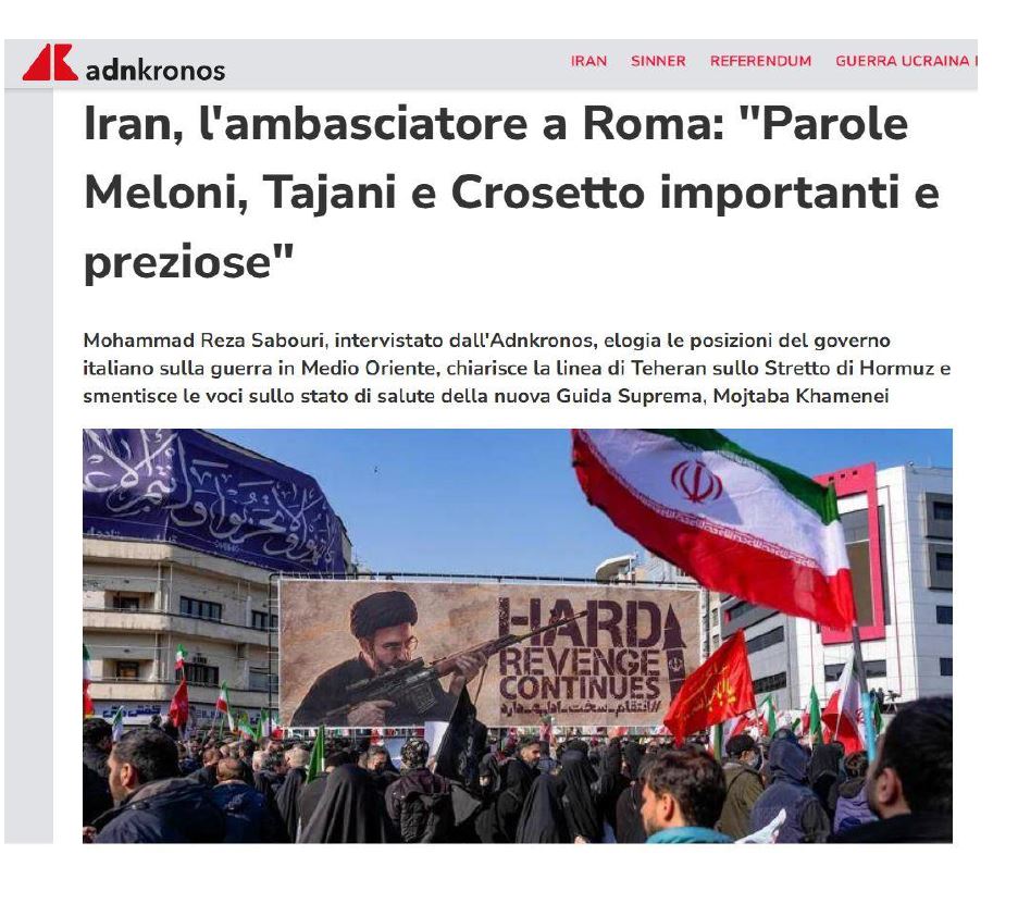 Le dichiarazioni del ministro della Difesa italiano sul carattere illegale e illegittimo dell’aggressione di Stati Uniti e Israele, la condanna dell’uccisione di bambini innocenti nella scuola di Minab da parte della signora Meloni, primo ministro italiano, e l’annuncio del ministro degli Esteri italiano di non aderire alla coalizione proposta da Trump riguardo allo Stretto di Hormuz sono molto importanti e preziosi. Purtroppo, tuttavia, assistiamo anche a dichiarazioni contraddittorie da parte di alcuni altri funzionari, che spero vengano presto corrette grazie a una migliore comprensione della realtà. In ogni caso, per noi le posizioni del popolo italiano sono molto importanti. In questi giorni e in queste notti ricevo numerosi messaggi da parte di cittadini italiani. Le molte manifestazioni contro la guerra organizzate in varie parti d’Italia lo dimostrano. Le persone esprimono il loro odio verso l’aggressione, la guerra e le uccisioni. Questi sentimenti autentici hanno per noi un grande valore. Gli iraniani, storicamente, considerano amici veri coloro che restano tali nei momenti difficili. A mio avviso, il popolo italiano è un vero amico dell’Iran.
